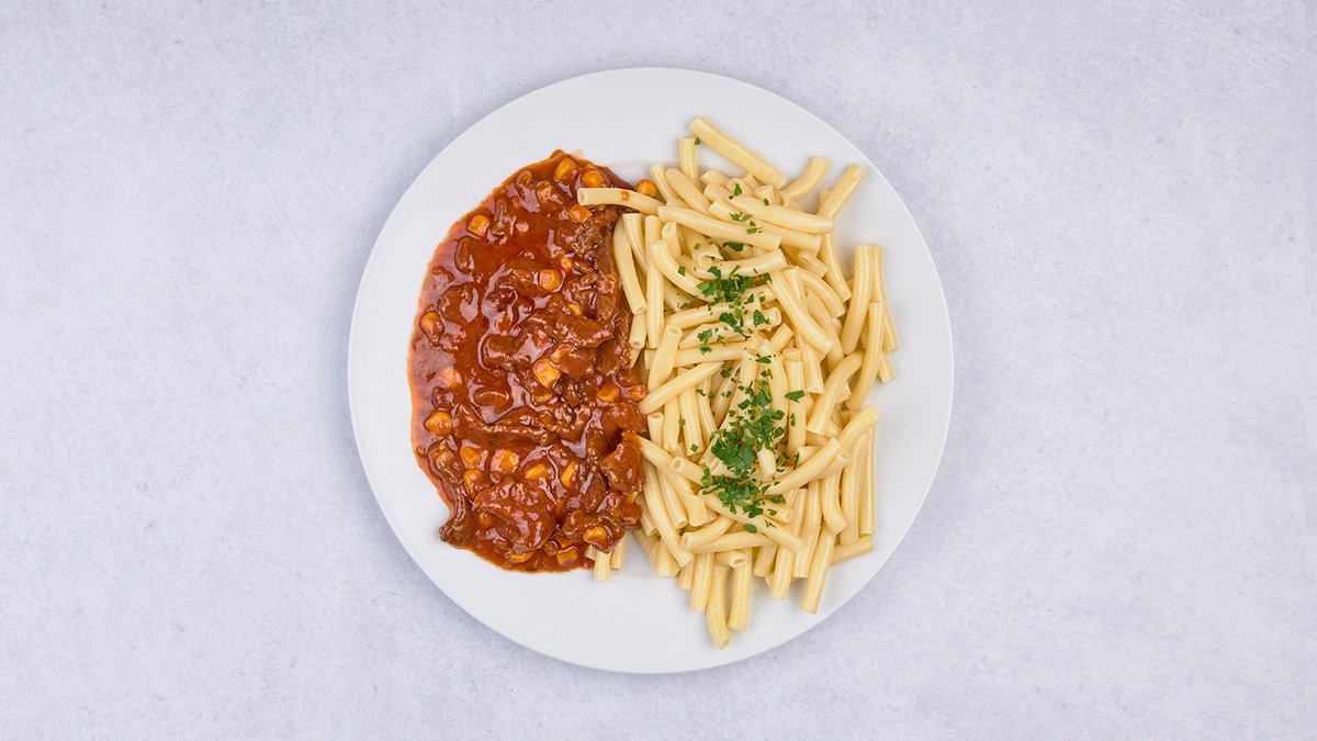 paradajkový pretlak, fazuľa, kukurica, cibuľa, mäso, smotana, syr + toast 270g / obsahuje: 1, 7
