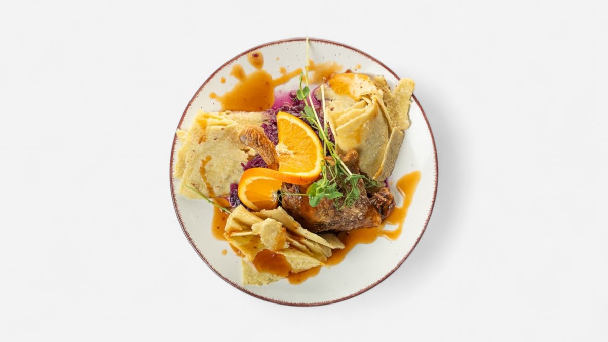 Pečené kačacie stehno s dusenou červenou kapustou s brusnicami a lokšami