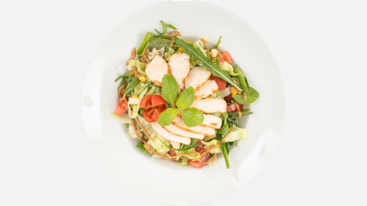 Čerstvá miešaná zelenina, slanina, parmezán, kuracie pásiky, krutóny, dresing, (hmotnosť: 300 g, alergény: 3,7,10)