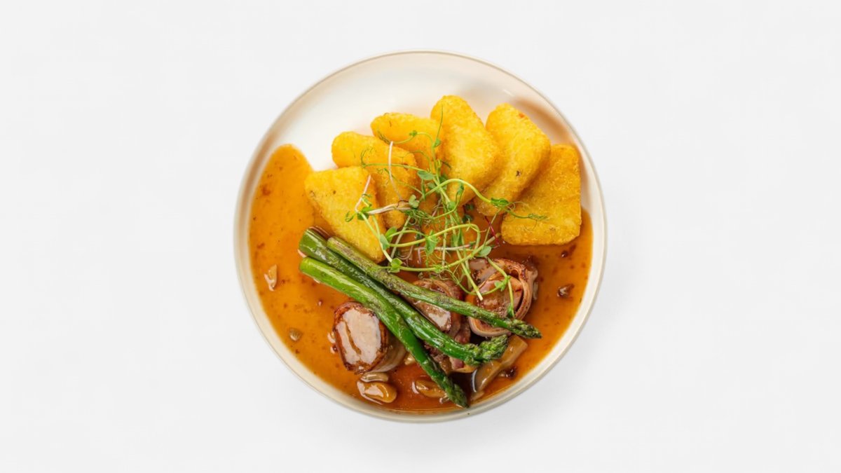 Grilovaná bravčová panenka obalená v slanine, na hubovom lôžku, so špargľou a zemiakovými rösti