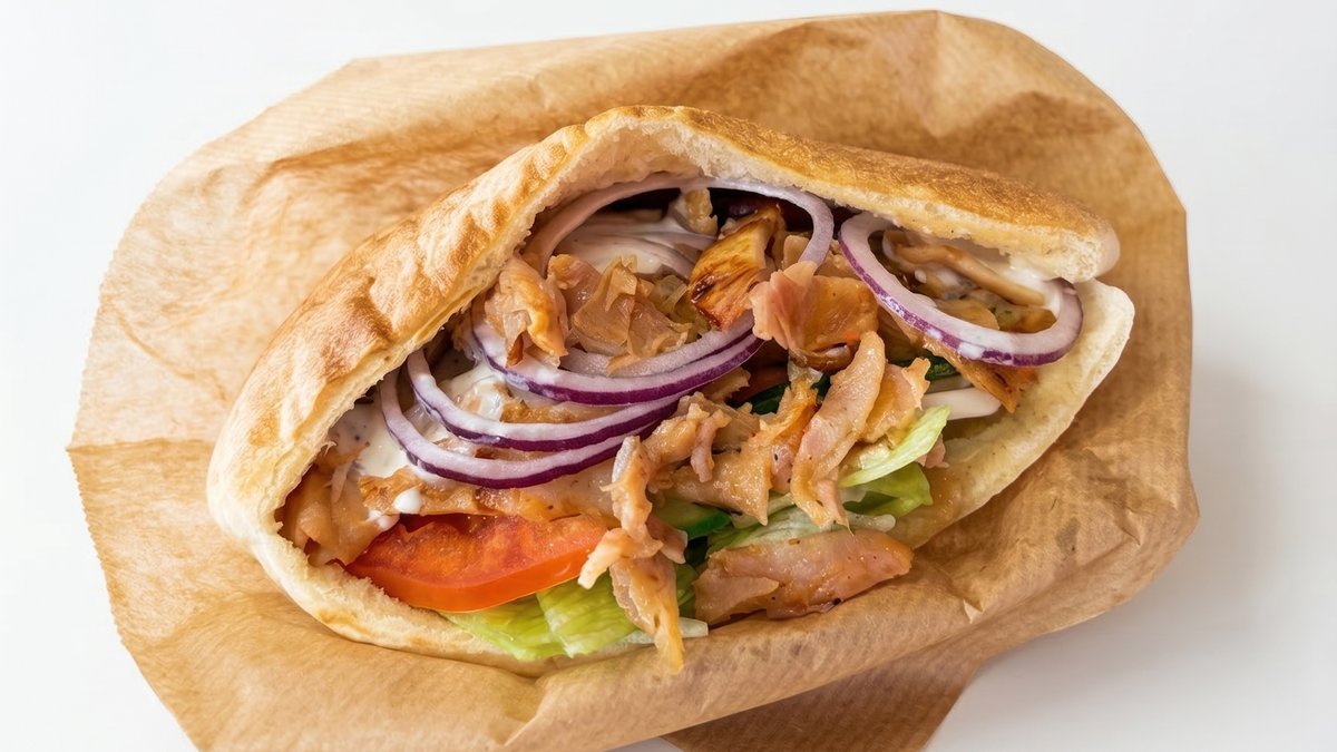 100g mäsa, pita, šalát, rajčiny, uhorka, cibuľa, cesnaková omáčka 300g/ obsahuje: 1,3,7,9,10 mutass még