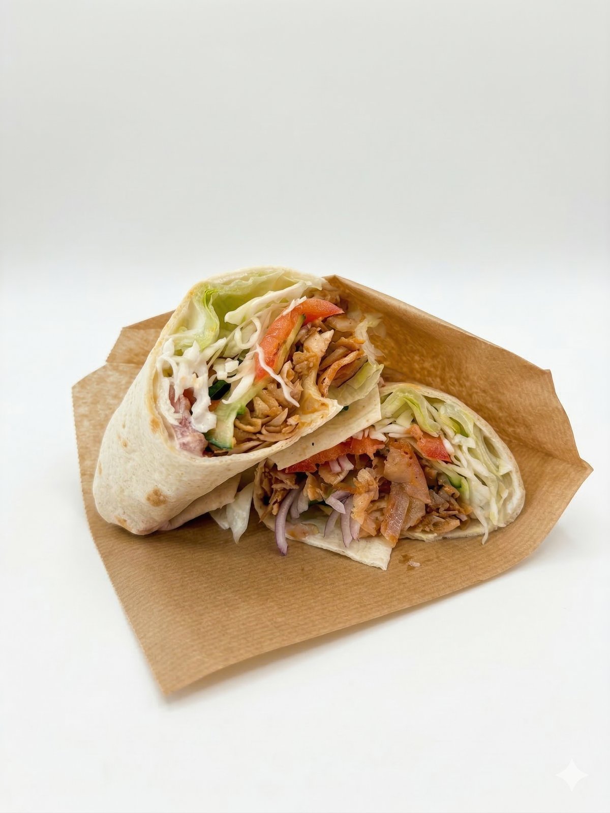 80g mäsa, tortilla, šalát, rajčiny, uhorka, cibuľa, cesnaková omáčka 250g / obsahuje: 1,3,7,9,10