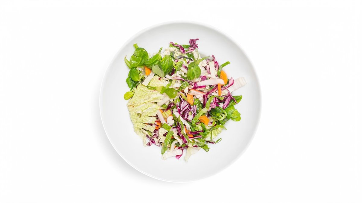 250 g ľadový šalát, kapusta, paradajky, uhorky, kukurica, omáčka, cibuľa