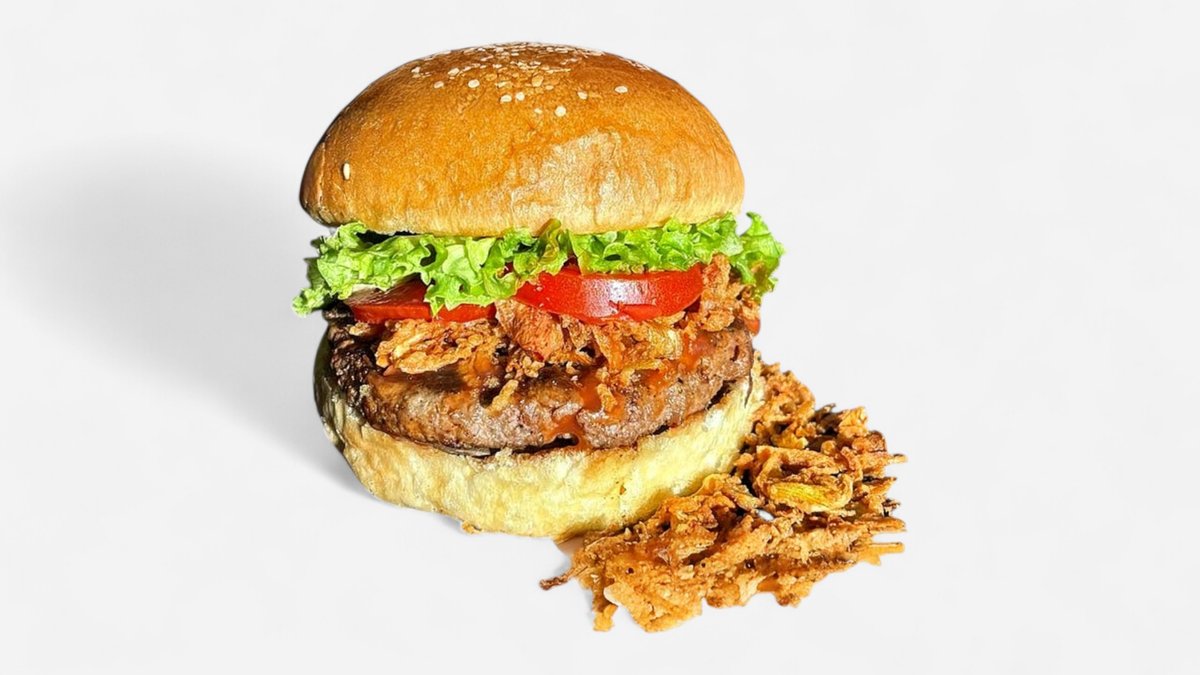 410 g Žemľa, hov.mäso, pikantná omačka, chedar, bacon, 3xcibuľové krúžky, volské oko, kečup, ľadový šalát, paradajky / obsahuje: 1,3,7,11