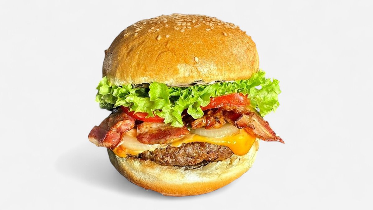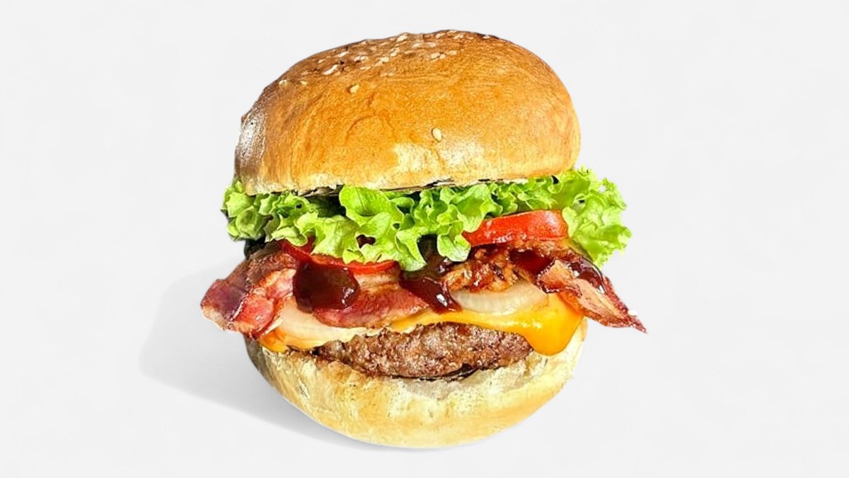 190 g Žemľa, hov. mäso, chedar, kyslé uhorky, cibuľa, BBQ omáčka, bacon, ladový šalát, paradajky, kečup / obsahuje: 1,3,7,11