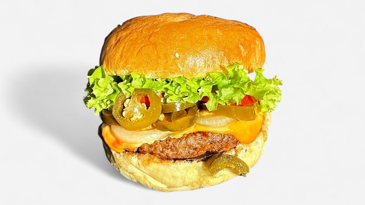 330 g Žemľa, hov.mäso, pikantná omačka, chedar, jalapeňo, cibuľa, kečup, ľadový šalát, paradajky / obsahuje: 1,3,7,11