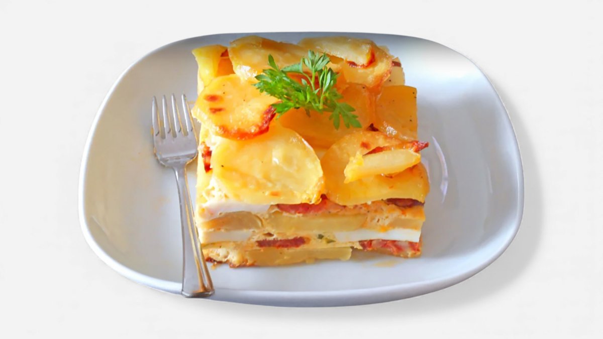 Menu 1: Gazdovské zapekané zemiaky, klobása, slaninka, cibuľa