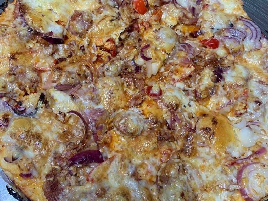 Tomat, syr, saláma, klobása, slanina, feferóny, vajce, cibuľa