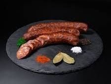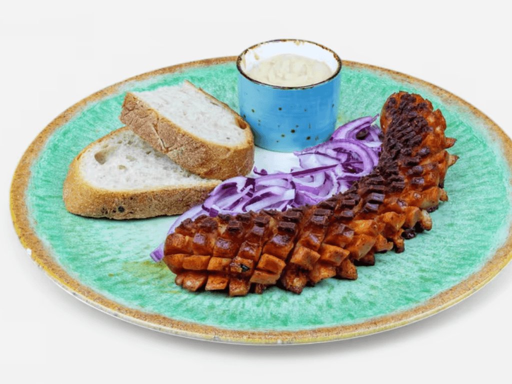 Hovädzia klobása, BBQ omáčka, slaninový džem, cesnaková majonéza, cheddar, fritovaná cibuľa