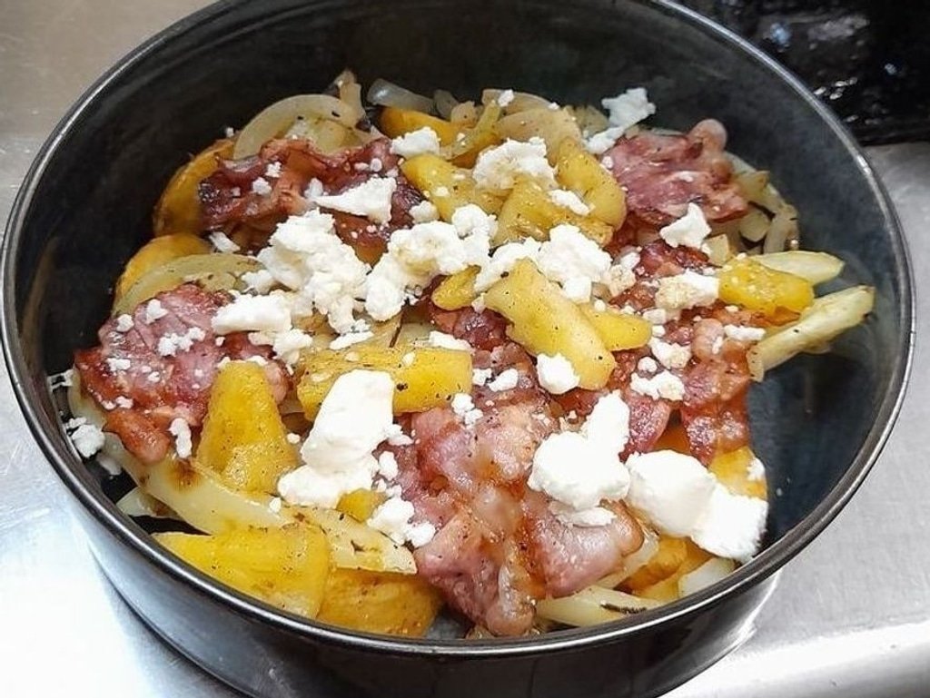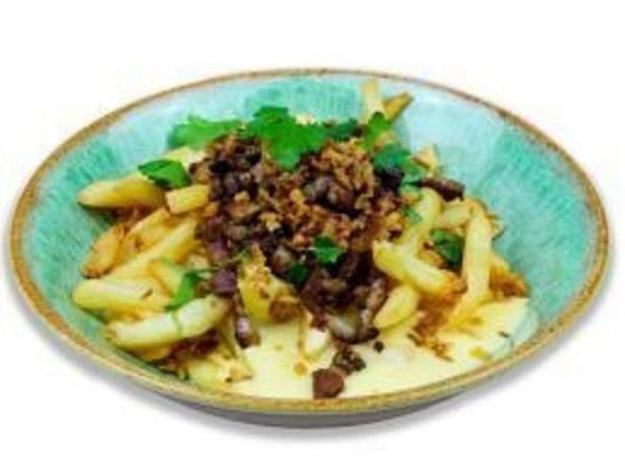 lodičky, cheddarová omáčka, pečený bôčik, fritovaná cibuľa