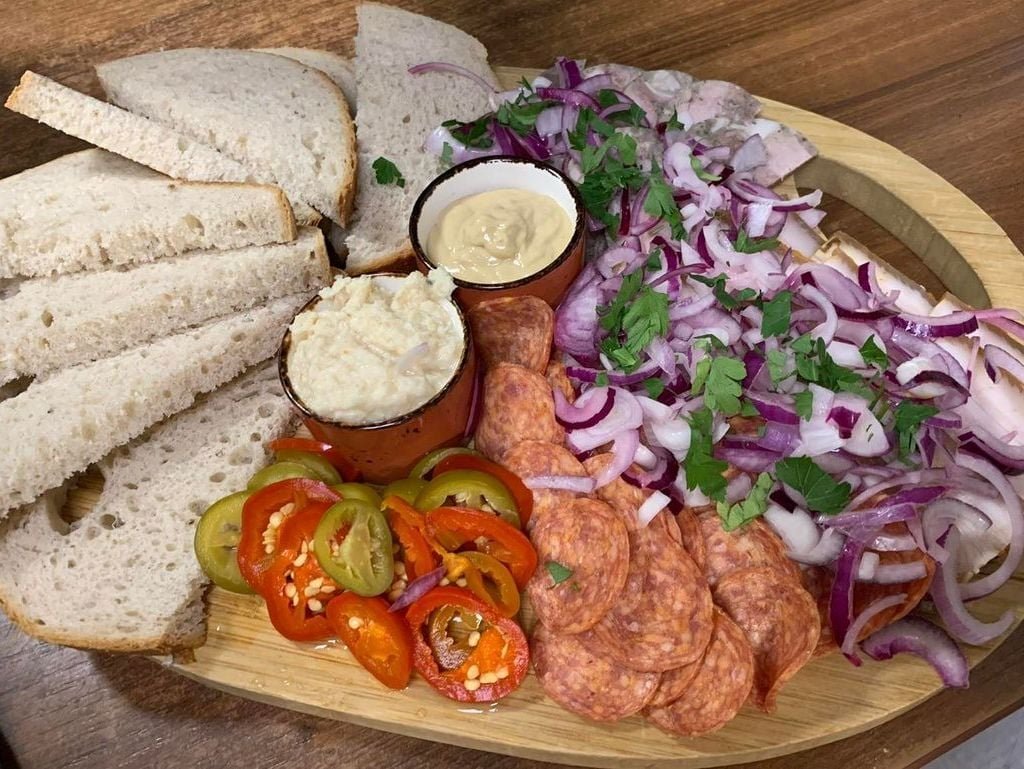 Oravská slanina, paprikovaný bôčik, klobása, nakladaná červená cibuľa, horčica, chren, feferóny, chlieb