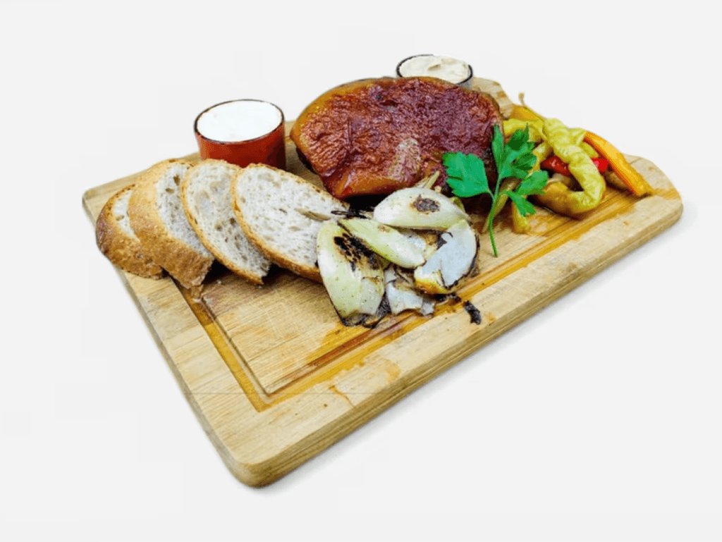 Údené koleno, chren, horčica, pečená cibuľa, baranie rohy, chlieb