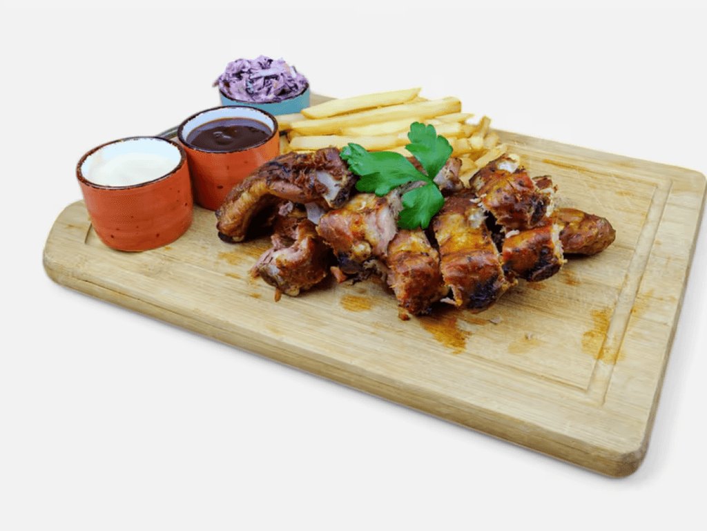 Bravčové rebrá, coleslaw, cesnaková majonéza, BBQ, hranolky