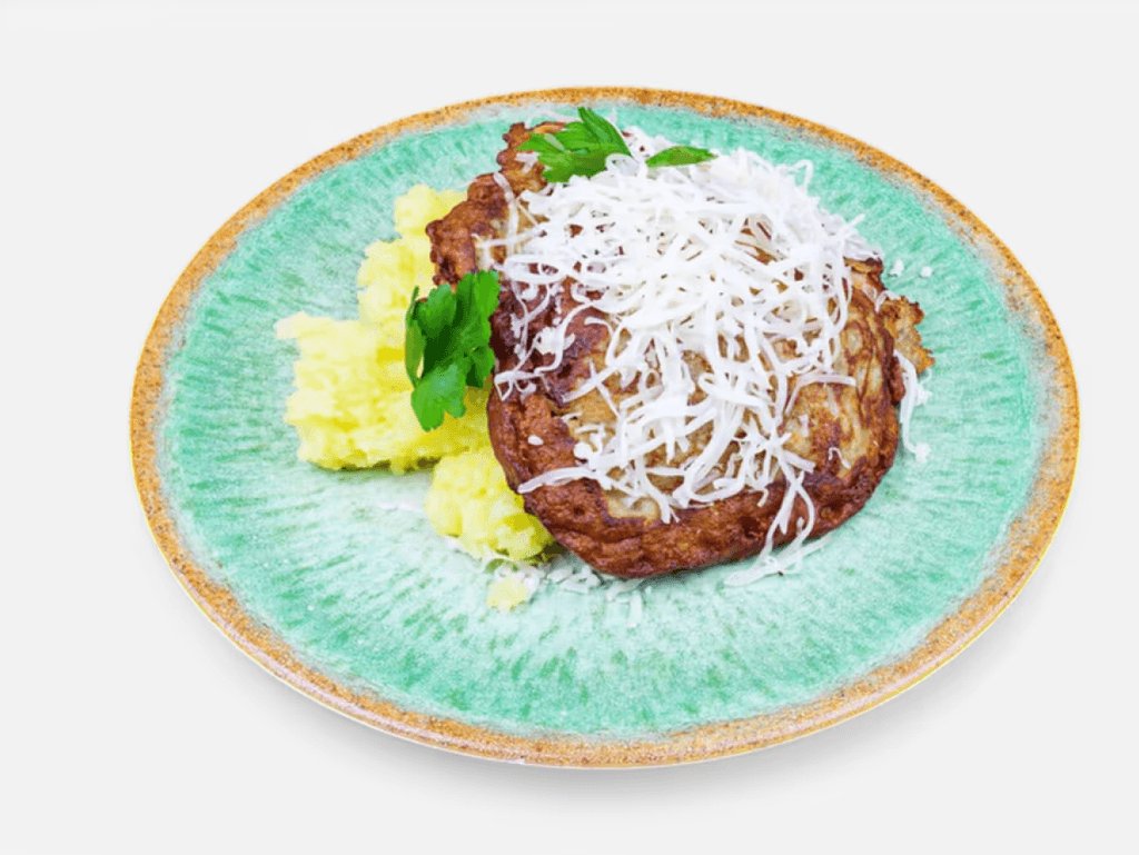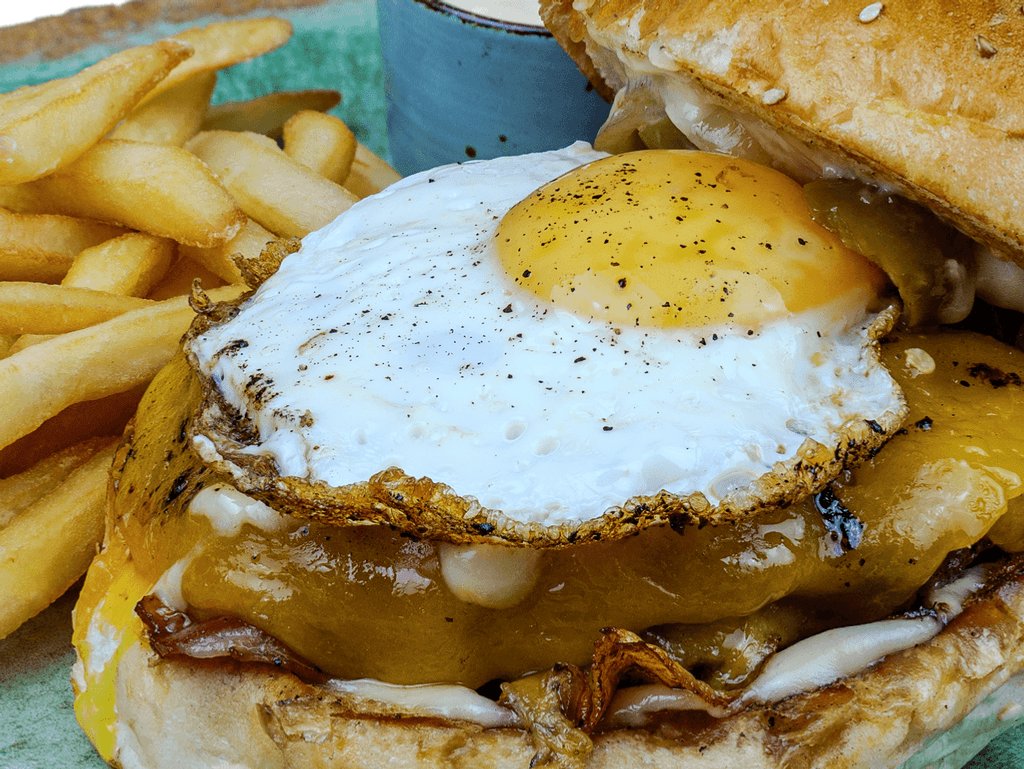 hovädzie mäso, žemľa, chedar, volské oko, cesnaková majonéza, pečená slanina, cibuľový džem, feferóny + hranolky, dressing podľa výberu