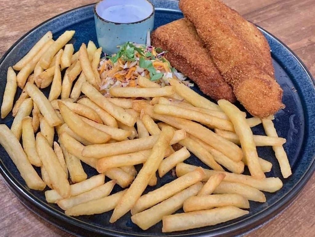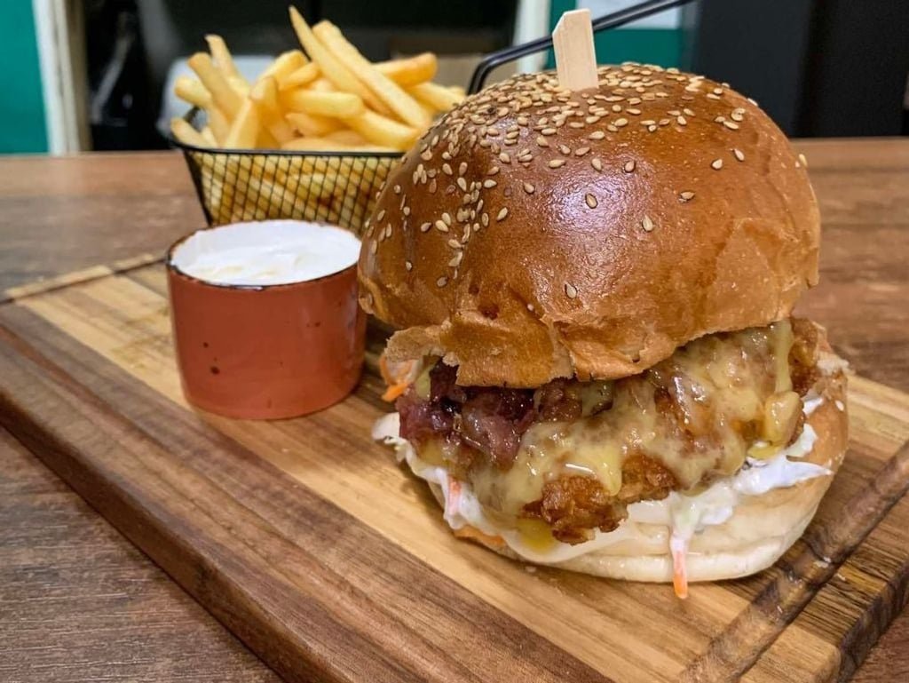 Kurací stehenný plátok v corn flakes, žemľa, cheddar, majonéza, coleslaw, slaninový džem + hranolky, dressing podľa výberu