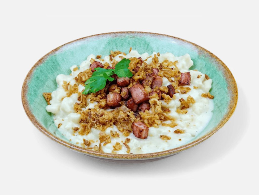 Zemiakové halušky, bryndza, kyslá smotana, slanina, fritovaná cibuľa