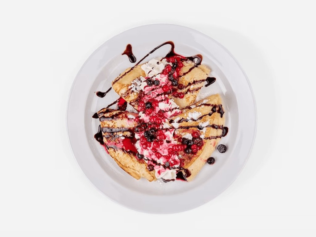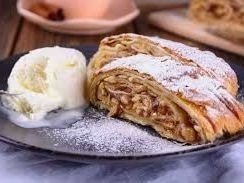Štrúdľa podľa ponuky, vanilková zmrzlina, práškový cukor