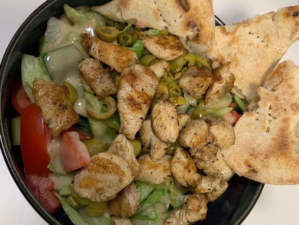 Kuracie prsia, čínska kapusta, uhorka, paradajka, zelené olivy, horčicový dressing, pizza rožky