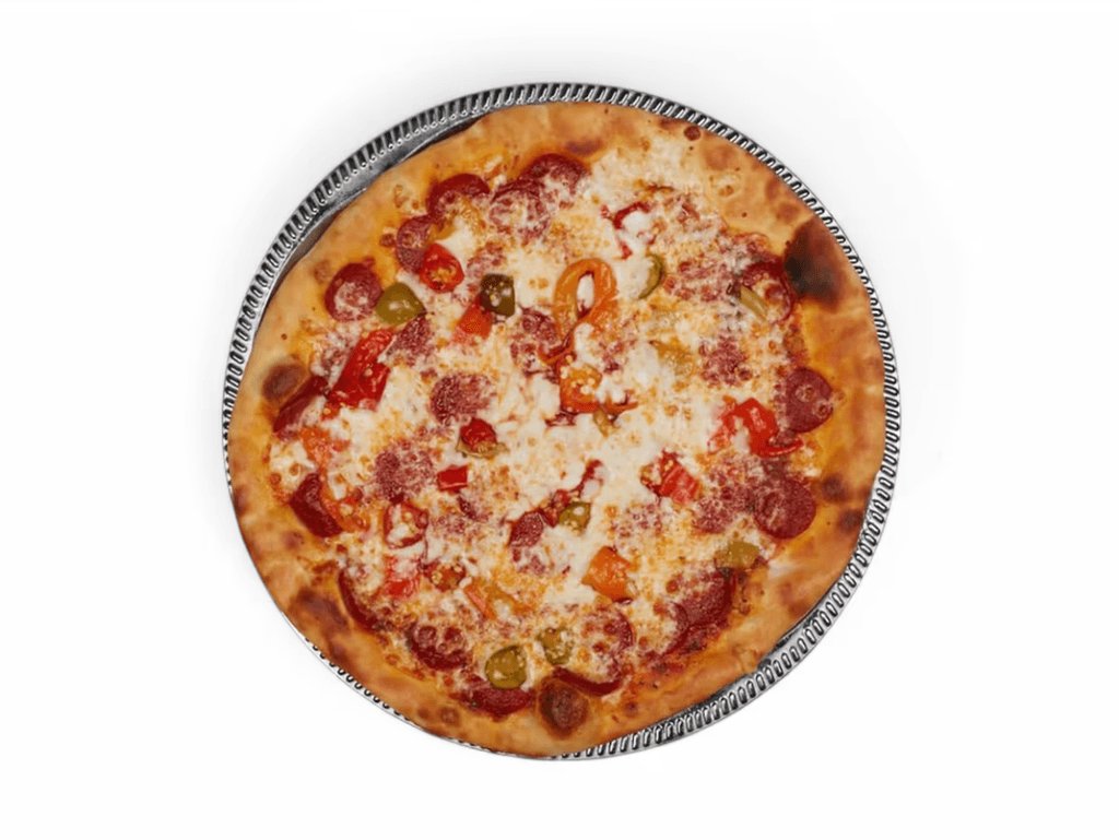 Tomat, syr, mozzarella, saláma, klobása, olivy, feferóny