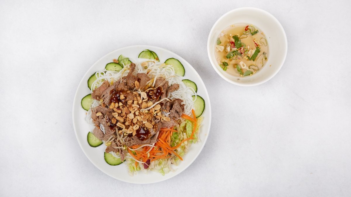 varené tenké ryžové rezance, ľadový šalát, mungo klíčky, uhorka, paprika, koriander, jarná cibuľka, pražené arašidy, vietnamská pražená cibuľka, sladko-kyslá rybacia zálievka, s restovaným hovädzím mäsom 500 g / obsahuje: 1, 4, 5