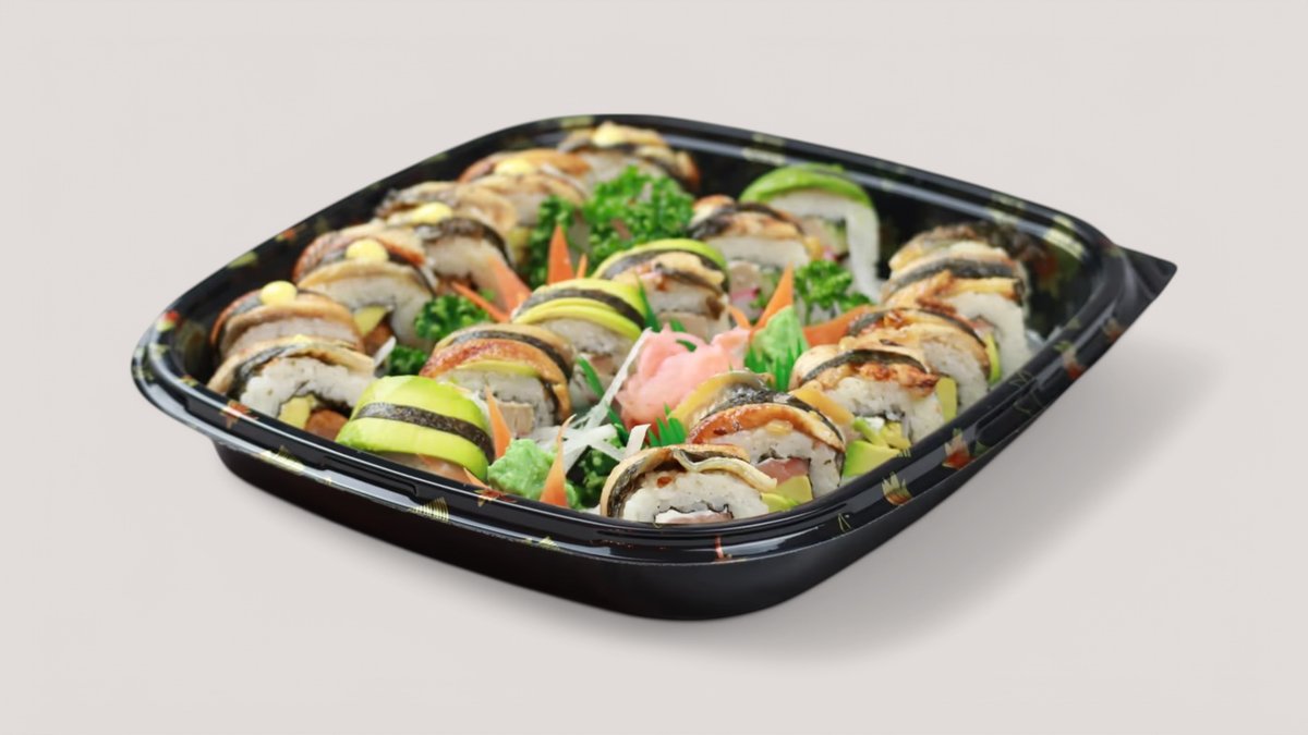 sushi ryža, Edamame (zelené fazuľky), mango, avokádo, wakame - morská riasa, červená reďkovka, vajce, uhorka, údený losos, kaviár z lososa, tuniak, jemne skladko-pikantné krevety, grilovaný úhor, krabia tyčinka, majonézový dressing, sójová omáčka 450-550 g / obsahuje: 2, 3, 4, 6, 11