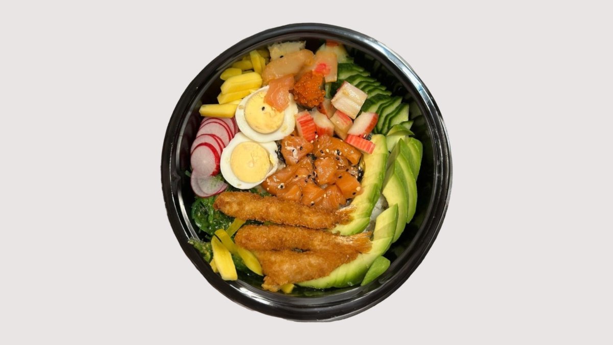 údený losos, grilované krevety sladko-jemne pikantné, sushi ryža, hlavné jedlo podľa vlastného výberu, červená reďkovka, uhorka, avokádo, mango, wakame (morská riasa), fazuľa, nakladaná reďkovka, sójová omáčka, sezam, mangová majonéza 350 g / obsahuje: 2, 4, 6, 11