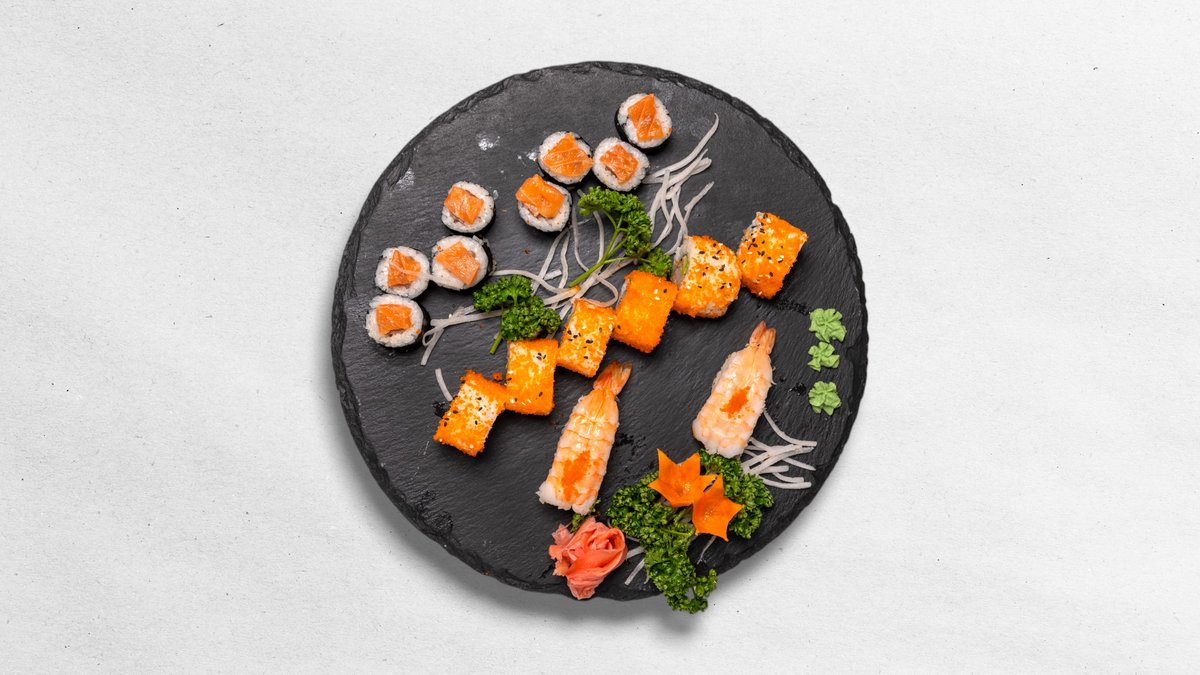 4x Maki tobiko, maslová ryba, Nigiri špargľa, tuniak, losos úhor, 5x Rainbow roll (kreveta v tempure, uhorka, syr / losos, avokádo, tuniak, maslová ryba) 520 g / obsahuje: 2, 4, 6