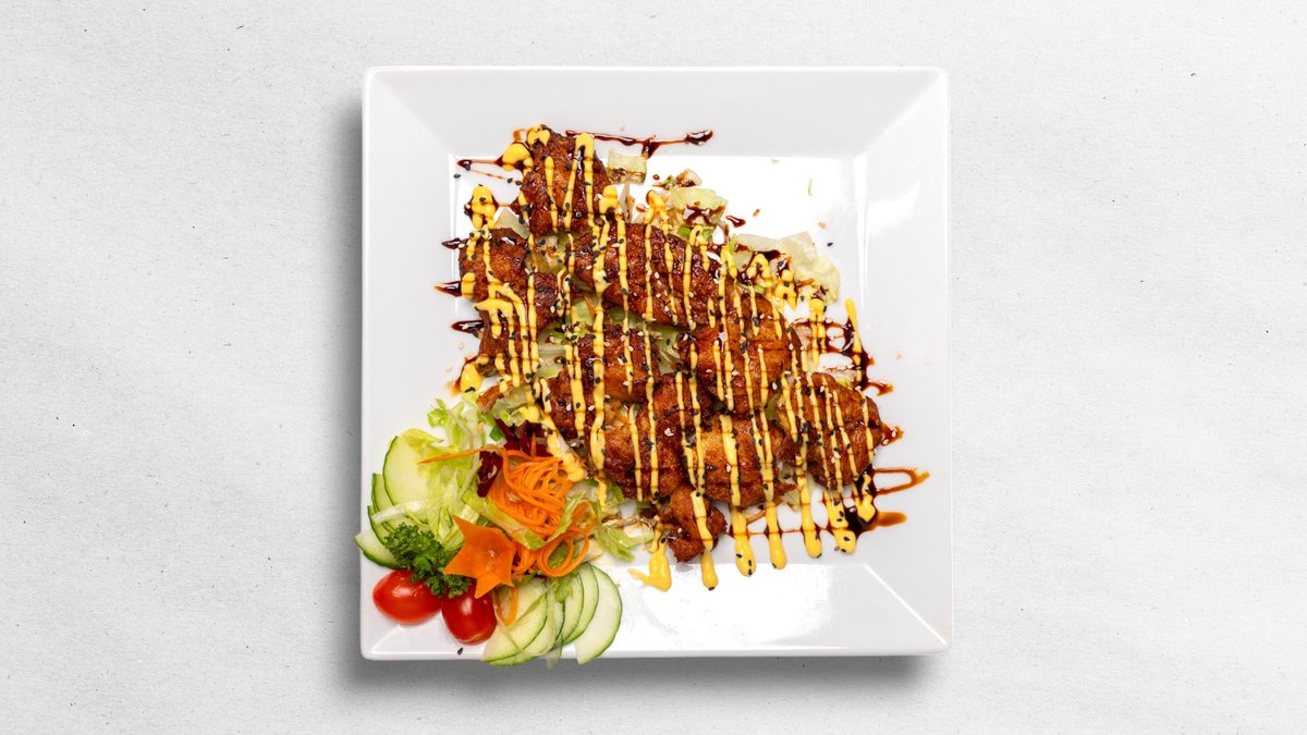 kuracie prsia vyprážané v tempura strúhanke, sushi ryža, hlavné jedlo podľa vlastného výberu, červená reďkovka, uhorka, avokádo, mango, wakame (morská riasa), fazuľa, nakladaná reďkovka, sójová omáčka, sezam, mangová majonéza 400-500 g / obsahuje: 1, 6, 7, 11