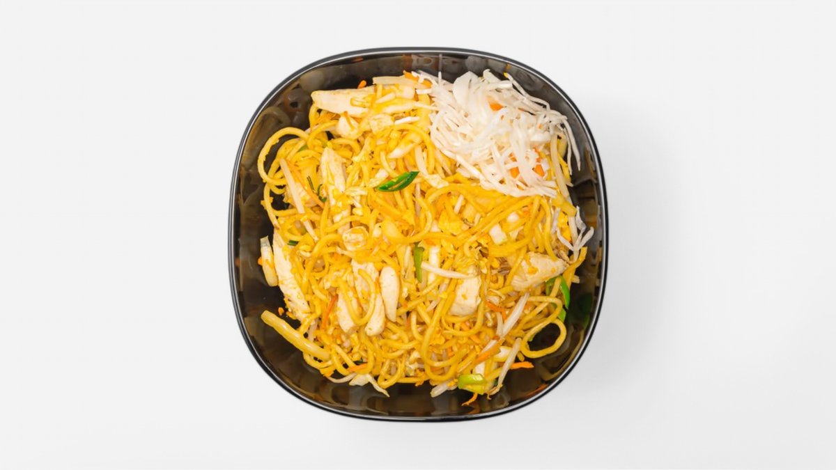 kuracie mäso , tenké ryžové rezance , zelenina , vajce , sójové klíčky 450g / obsahuje: 3,6