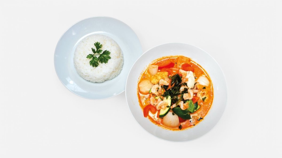 krevety , kokosové mlieko , červené kary , mrkva , šampiňóny , cuketa 250g / obsahuje: 2,3,6