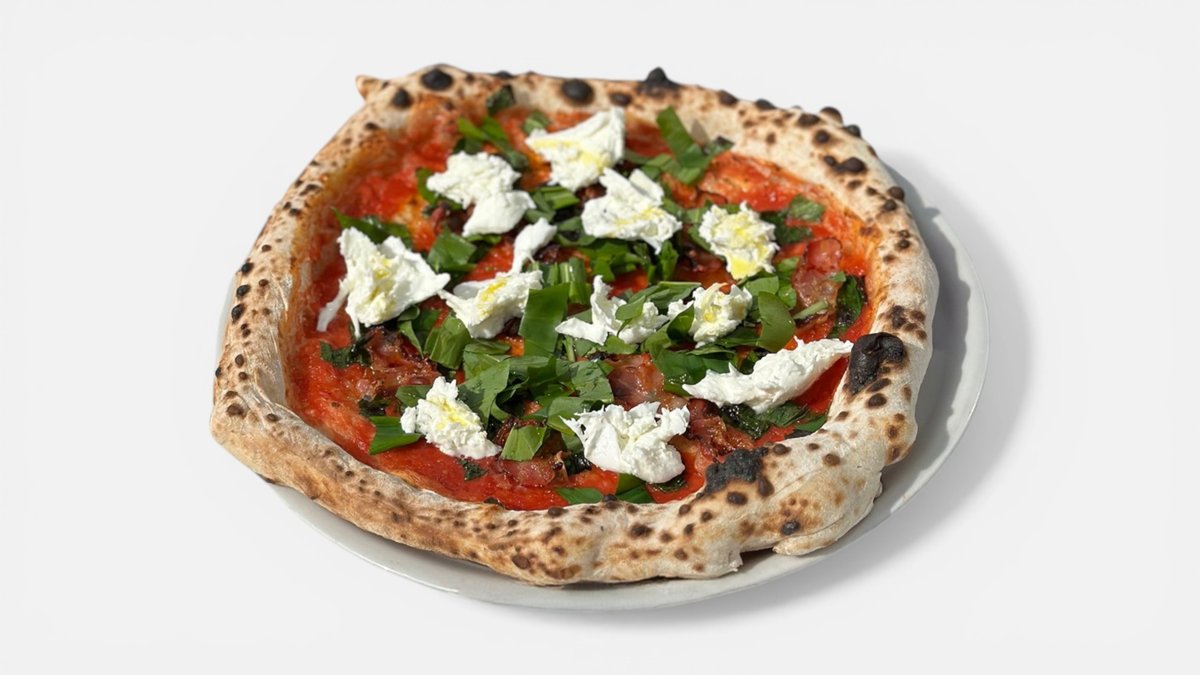 paradajkový základ San Marzano, mozzarella fior di latte, slanina, nakladané reďkovky, klíčky, čerstvý chren 400g / obsahuje alergény: 1,7