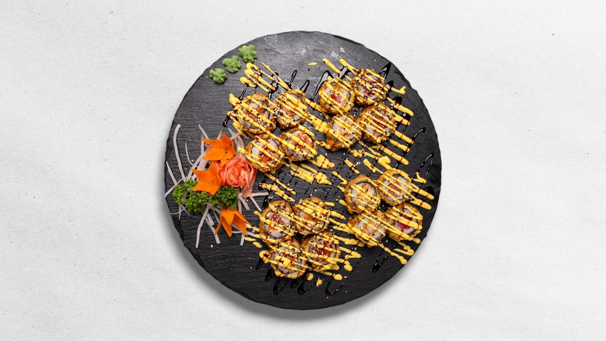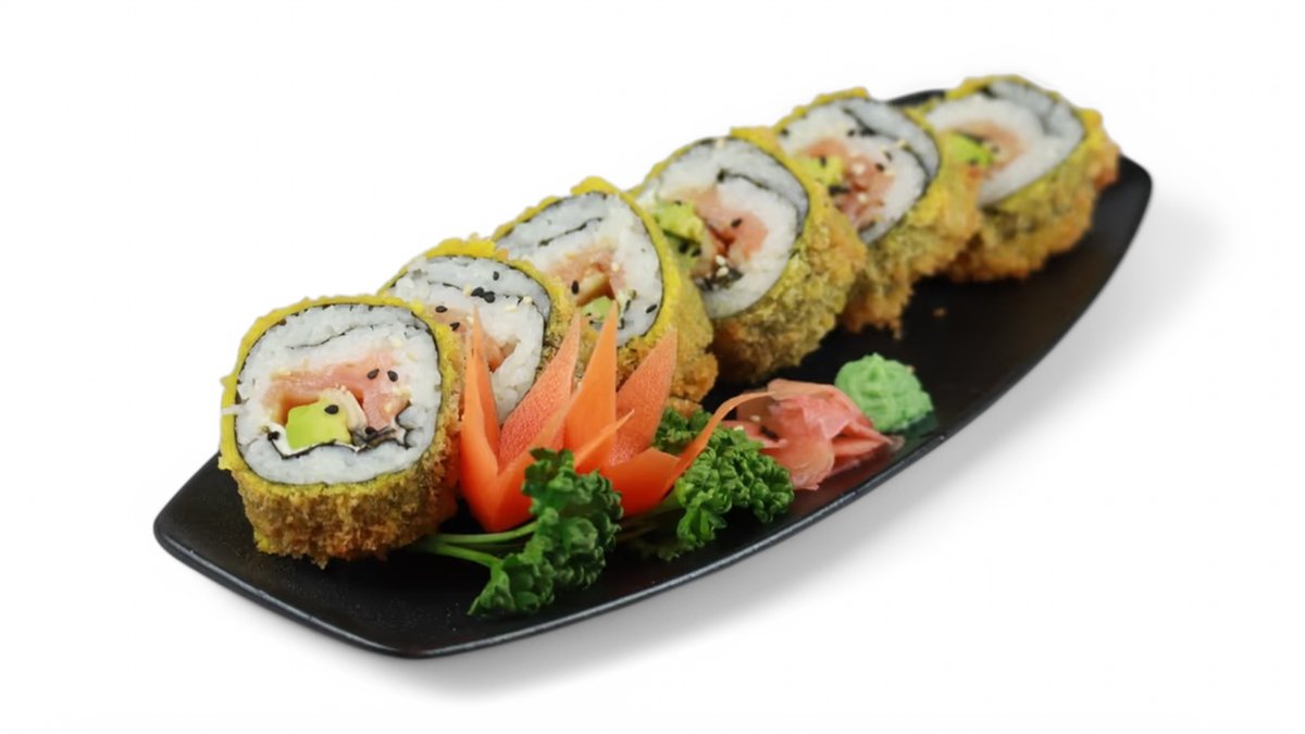Sushi ryža, tempura (losos, tuniak, krevety, tofu), červená reďkovka, uhorka, avokádo, mango, wakame (morská riasa), nakladaná reďkovka, fazuľa, sójová omáčka, sezam, mangová majonéza. 550 - 700 g / obsahuje alergény: 1,2,4,6,11