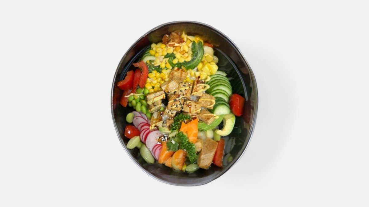 Sushi ryža, grilovaný tofu, sladko-kyslá mrkva, cherry paradajka, paprika, kukurica, červená reďkovka, uhorka, avokádo, mango, wakame (morská riasa), nakladaná reďkovka, fazuľa, sójová omáčka, sezam, mangová majonéza. 550 - 700 g / obsahuje alergény: 1,6,11
