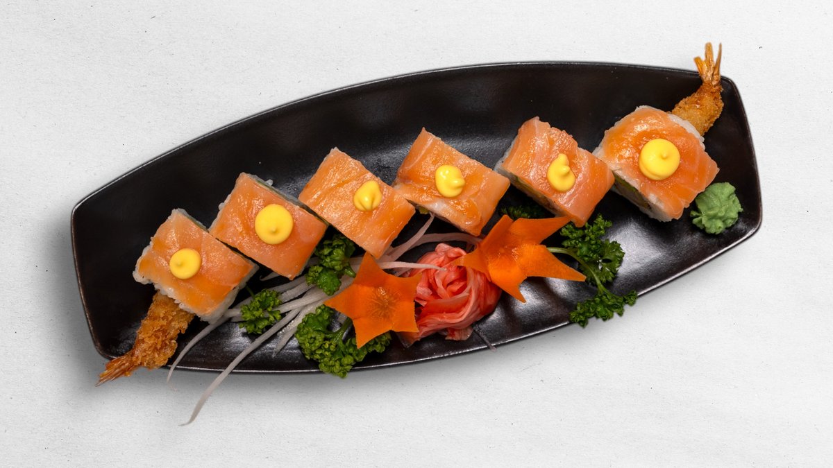 Sushi ryža, čerstvý losos, krevety tempura, vajca, kaviár z lososa, krabia tyčinka, údený losos, červená reďkovka, uhorka, avokádo, mango, wakame (morská riasa), nakladaná reďkovka, fazuľa, sójová omáčka, sezam, mangová majonéza. 550 - 700 g / obsahuje alergény: 1,2,4,6,11