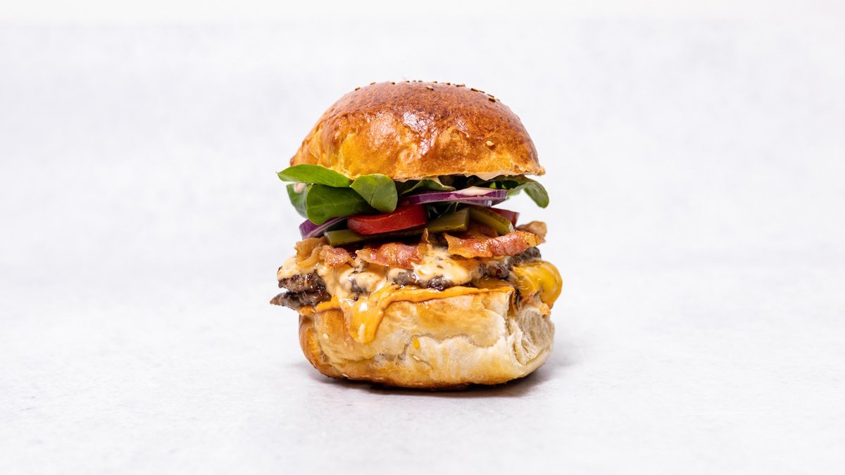170g hovädzie mäso, corgoň mayo, domáca maslová žemľa, syr Cheddar, slanina, uhorka, cherry paradajka, cibuľa, šalát, slaninový dressing 330g / obsahuje: 1, 3, 7, 10, 11