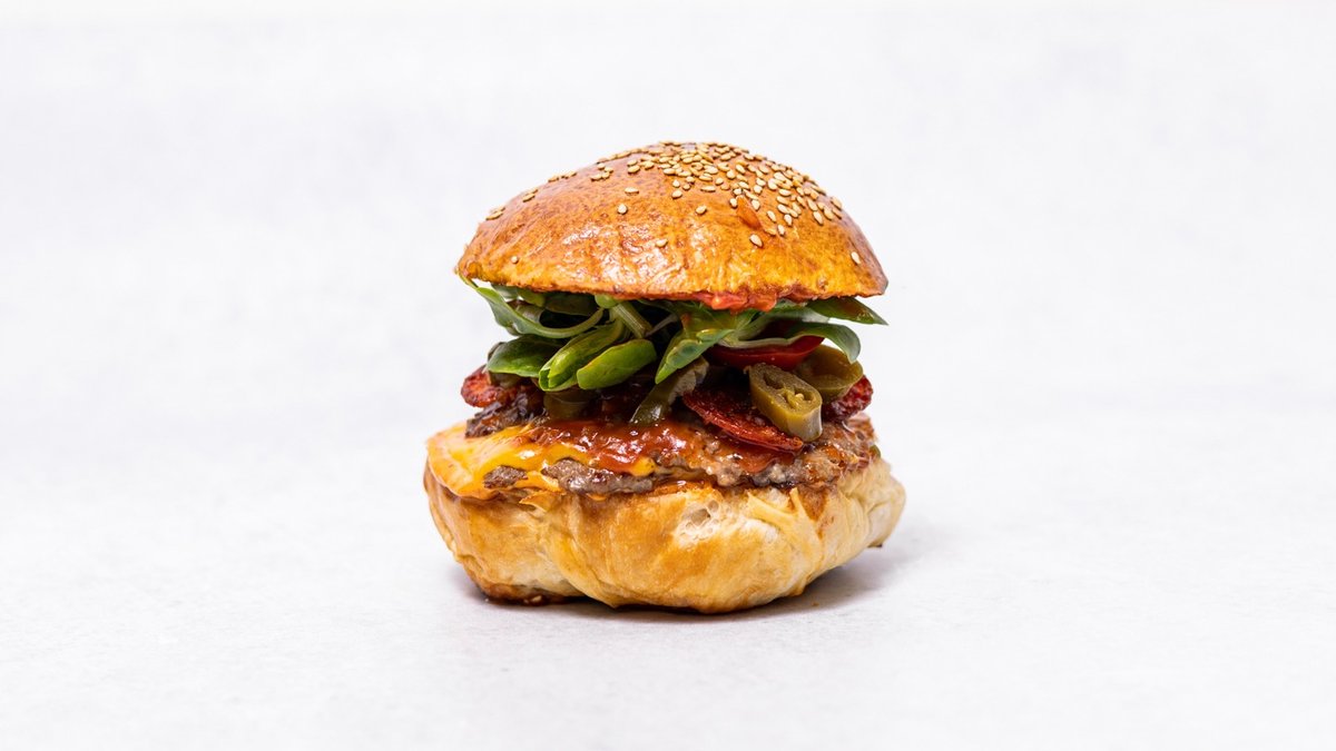 170 g hov. mäso, corgoň mayo, domáca maslová žemľa, cheddar, pikantná saláma, jalapeňos, cherry paradajka, šalát, chilli omáčka 360 g / obsahuje: 1, 3, 7, 10, 11