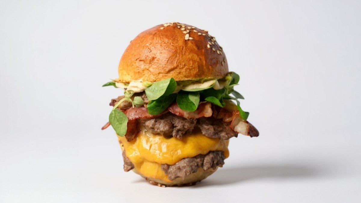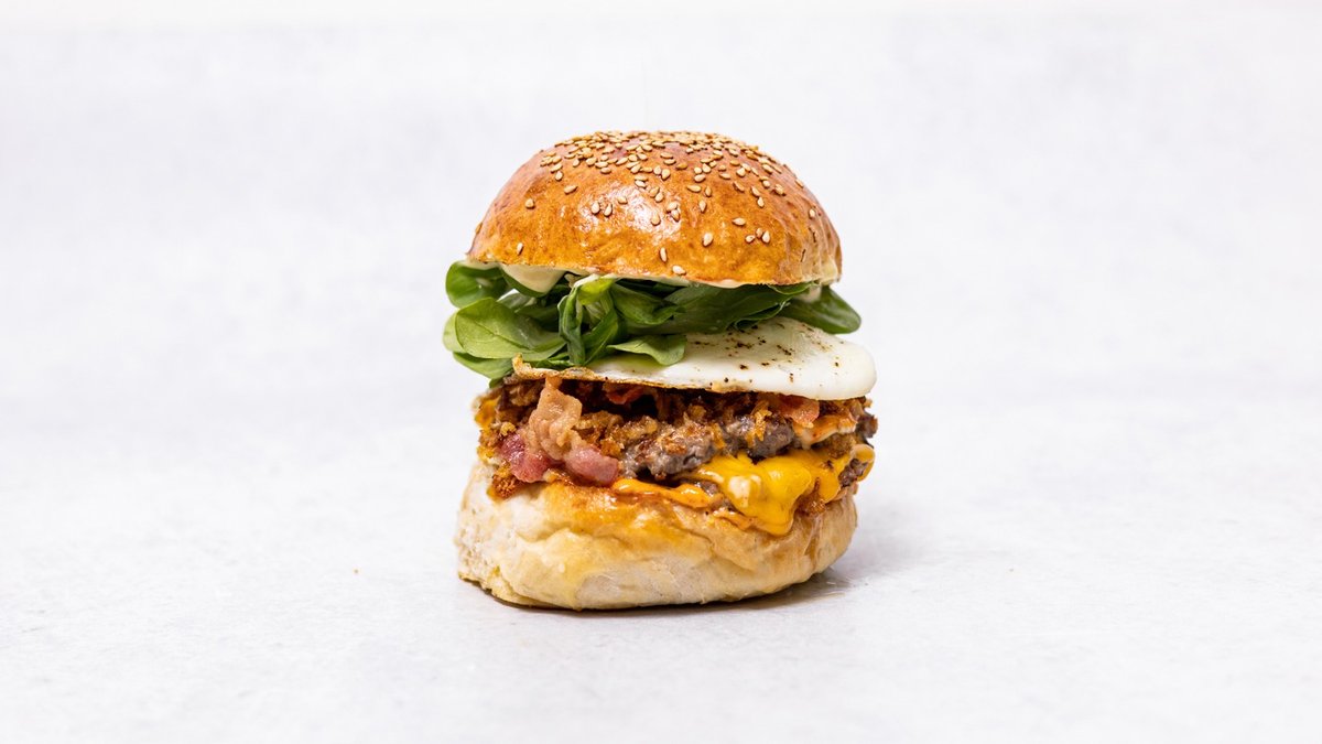 170g hovädzie mäso, corgoň mayo, domáca maslová žemľa, syr Cheddar, 2x slanina, restovaná cibuľa, vajce, šalát, medovo-horčicová omáčka 360g / obsahuje: 1, 3, 7, 10, 11