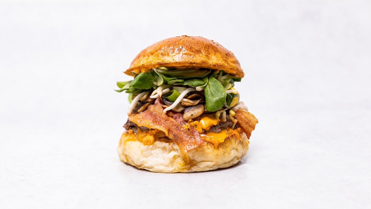 170 g hov. mäso, corgoň mayo, domáca maslová žemľa, cheddar, slaninka, šampiňóny, jarná cibuľka, klíčky, šalát, andalúzsky dresing 360 g / obsahuje: 1, 3, 7, 10, 11