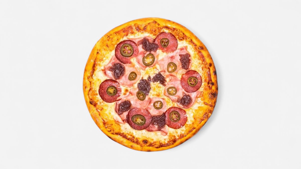 paradajkový alebo smotanovo-syrový základ, 1/2 syr Mozzarella, 1/2 syr Eidam, saláma, slanina, jalapeňos, hranolky 550 g / obsahuje: 1, 7