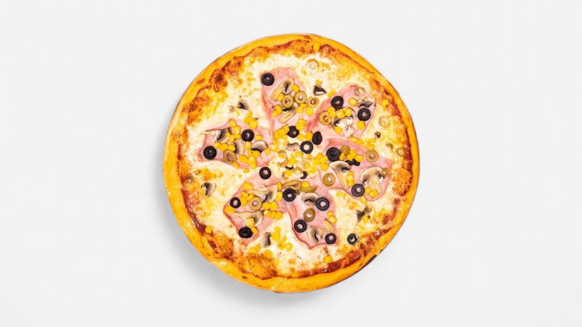 paradajkový alebo smotanovo-syrový základ,1/2 mozzarella, 1/2 eidam, šunka, šampiňóny, olivy, kukurica 480 g / obsahuje: 1, 7