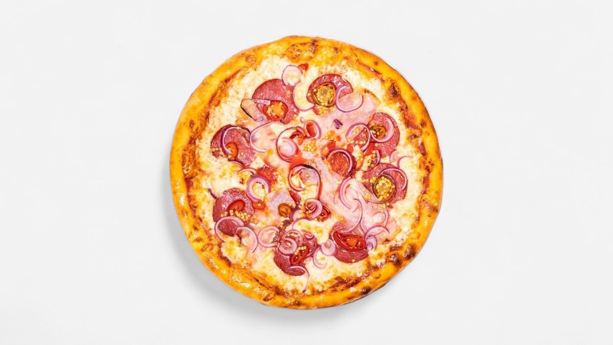 paradajkový alebo smotanovo-syrový základ,1/2 mozzarella, 1/2 eidam, saláma, karamelizovaná cibuľka, jalapeňos 490 g / obsahuje: 1, 7
