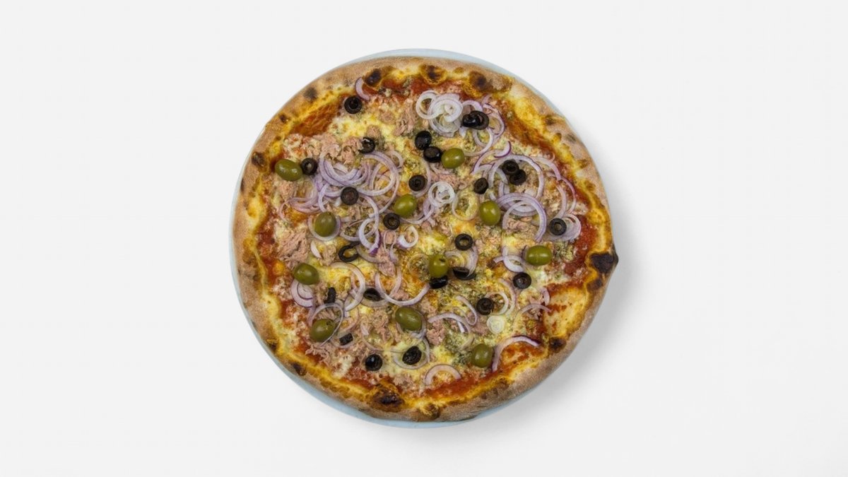 paradajkový alebo smotanovo-syrový základ,1/2 mozzarella, 1/2 eidam, tuniak, cibuľa, olivy 430 g / obsahuje: 1, 4, 7