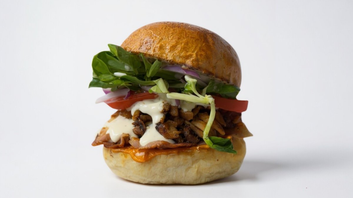 170g hovädzie mäso, corgoň mayo, domáca maslová žemľa, syr Cheddar, slanina, šampiňóny, jarná cibuľa, klíčky, šalát, andalúzsky dressing 360g / obsahuje: 1, 3, 7, 10, 11