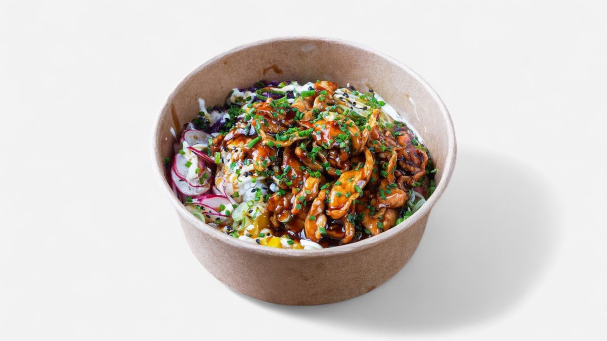 Grilovaný kuracie prsia s teriyaki omáčkou, sushi ryža, edamame, marinovaná uhorka, mango, reďkovka, mrkva, mungo klíčy, nakladaný zázvor, jarná cibuľka, japonská mayo, teriyaki, sézam