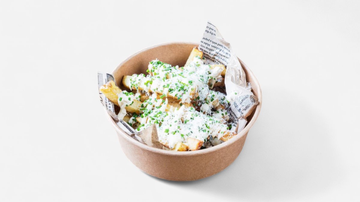 Domáce 2x fritované hranolky, cesnak, hľuzovková majonéza, parmezán, pažítka