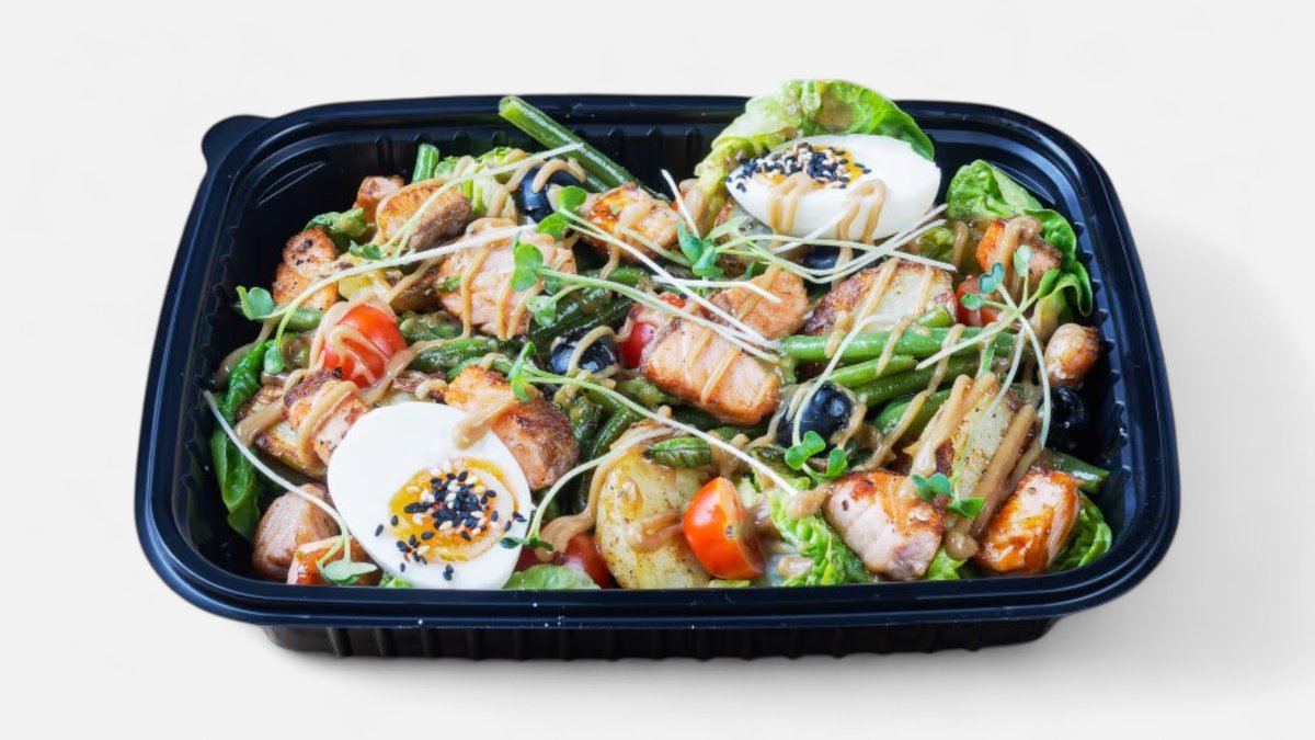 Grilovaný losos, opekané baby zemiaky, restované zelené fazuľky, cherry paradajky, olivy, vajce na mäkko, baby rímsky šalát, horčicovo-medová redukcia