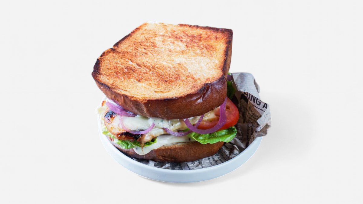 Grilované marinované kuracie prsia, domáci maslový toast, syr Monterey Jack, pažítkové aioli, hlávkový šalát, chrumkavá slanina, paradajka, nakladaná červená cibuľa, BBQ omáčka