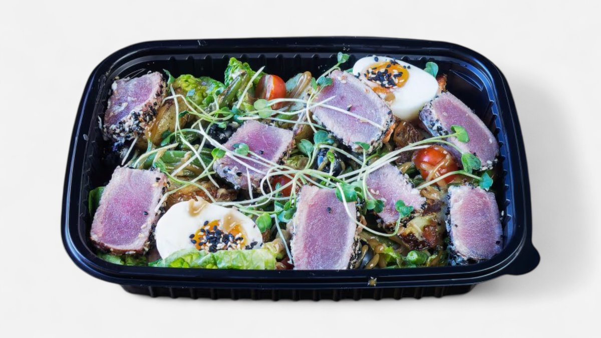 Grilovaný tuniak, opekané baby zemiaky, restované zelené fazuľky, cherry paradajky, olivy, vajce na mäkko, baby rímsky šalát, horčicovo-medová redukcia