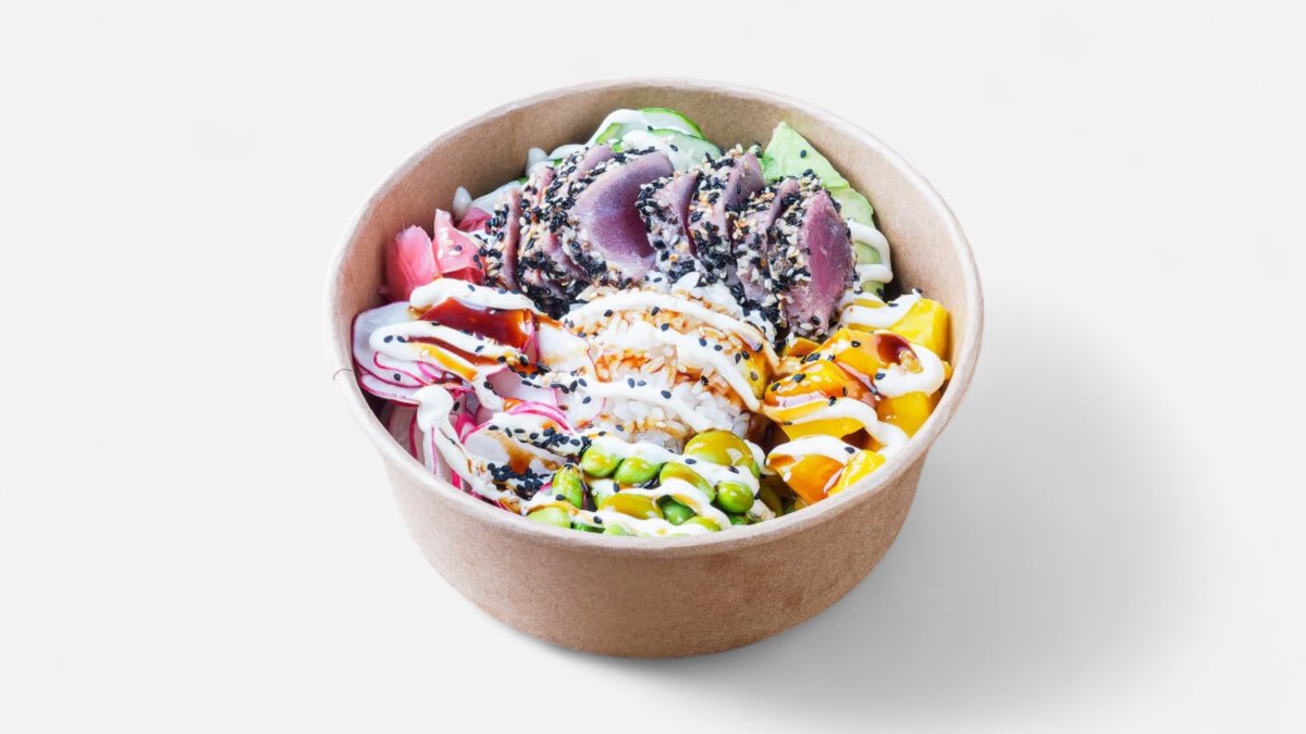 Grilovaný tuniak v sezamovej kruste, sushi ryža, avokádo, edamame, mango, marinovaná uhorka, mkrva, reďkovka, mungo klíčky, nakladaný zázvor, jarná cibuľka, masago kaviár, teriyaki, japonská mayo