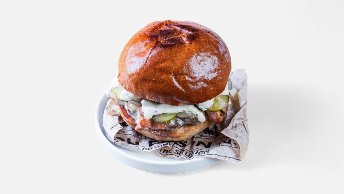 180g naše mleté hovädzie mäso, syr Monterey Jack, chrumkavá slanina s javorovým sirupom, karamelizovaná biela cibuľa, aioli s pažítkou a konfitovaným cesnakom, domáce pickles uhorky, maslová burgerová brioche žemľa